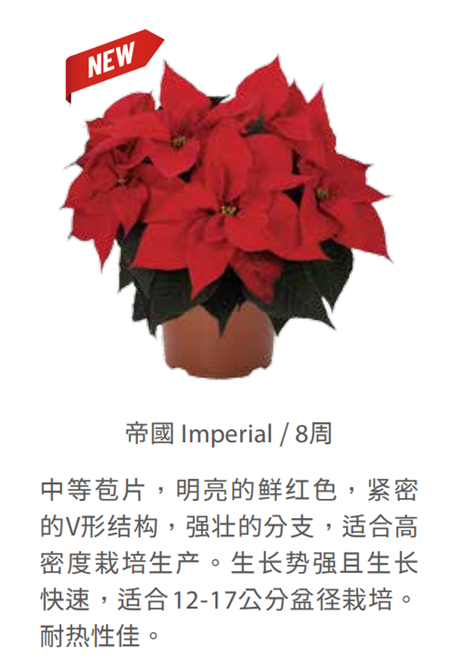 具有中等苞片,明亮的鲜红色,紧密的V形结构,强壮的分支,适合高密度栽培生产。生长势强且生长快速,适合12-17公分盆径栽培。耐热性佳。