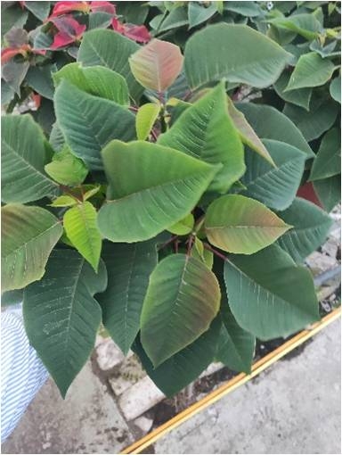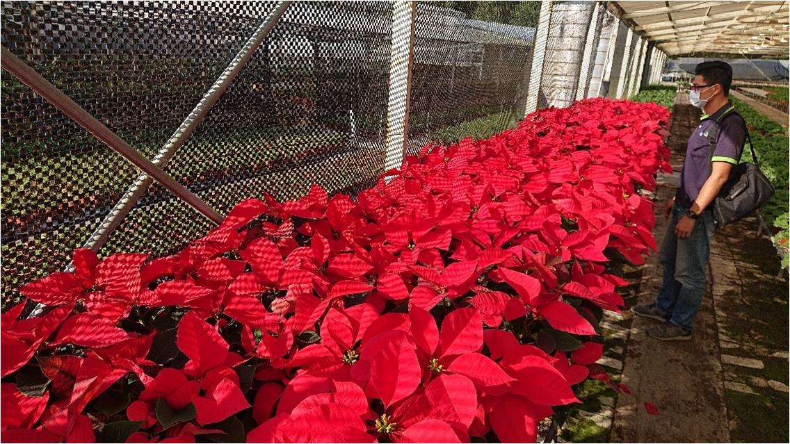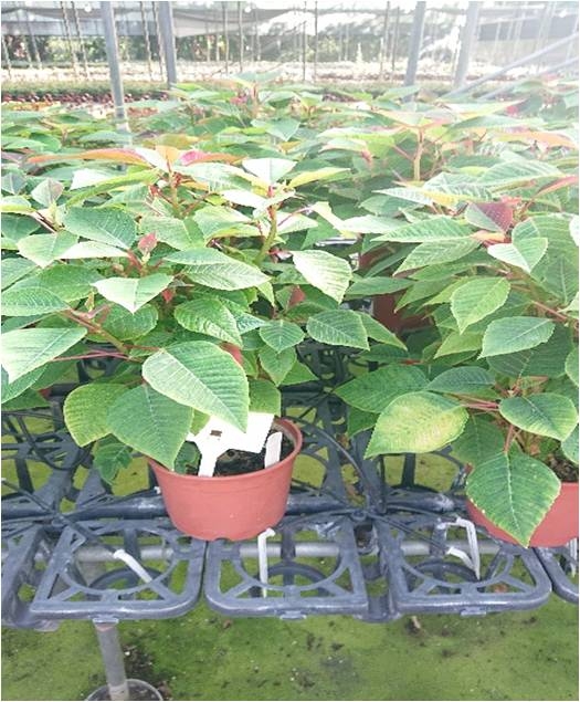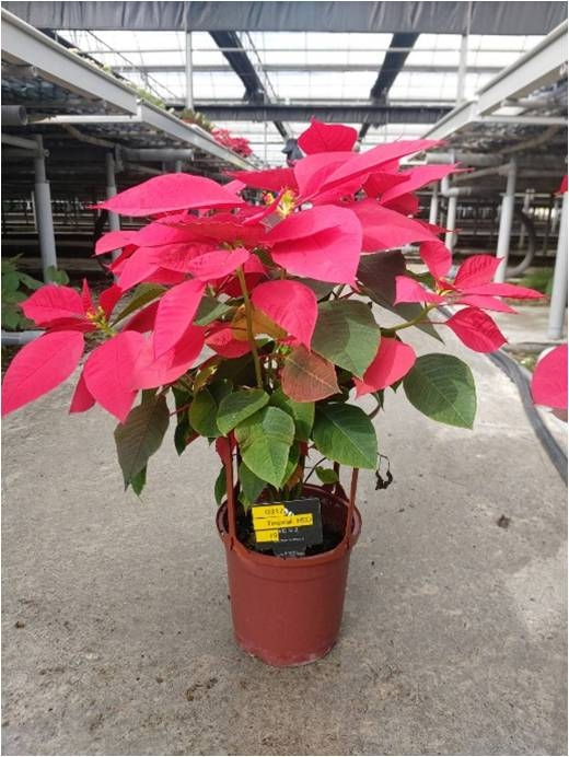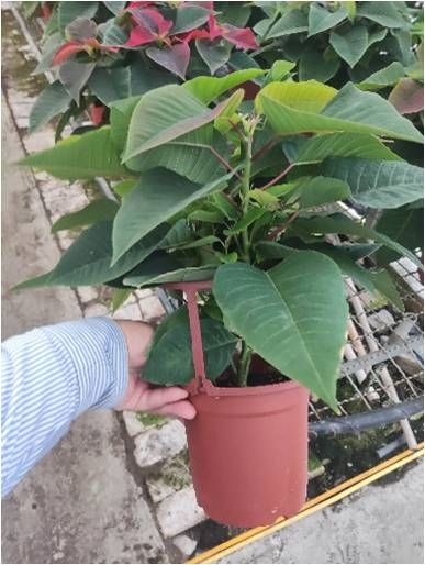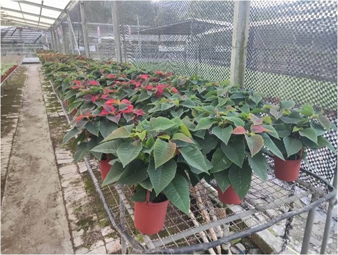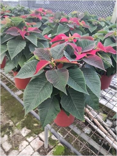 2022年的炎炎夏日中,橙色多盟的一品红种苗,实际于台湾地区种植的夏天中栽培表现照片,类似于广州上海区域平地的炎热气候,一品红「帝国Imperial」品种耐热性表现出众,能够正常渡夏,无任何生长问题,具有耐热性佳的优良栽培特性,苞片大而圆整,表现为鲜明亮红色。