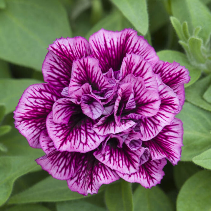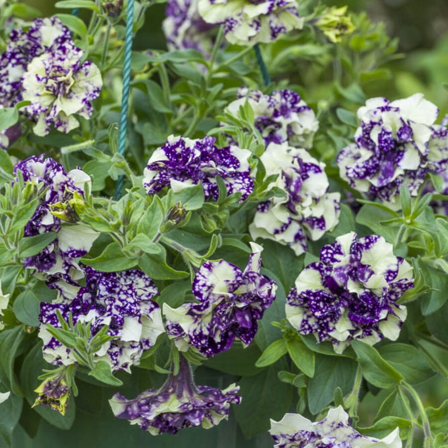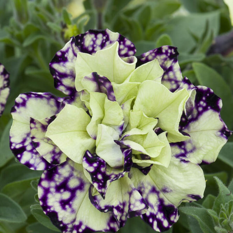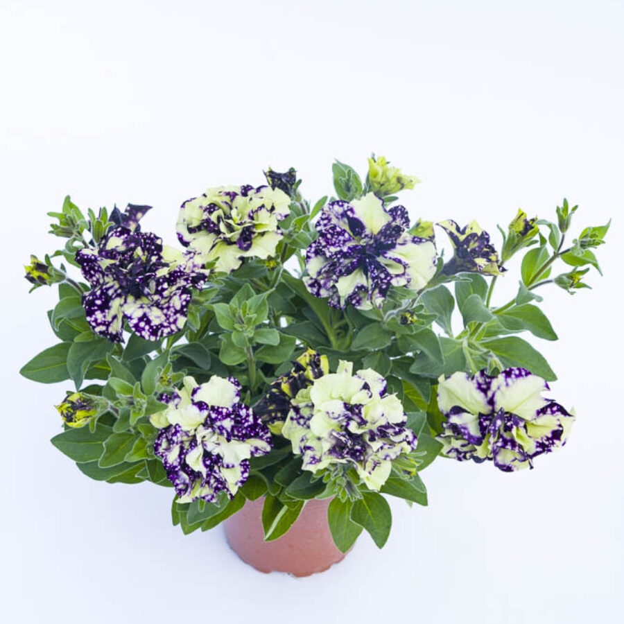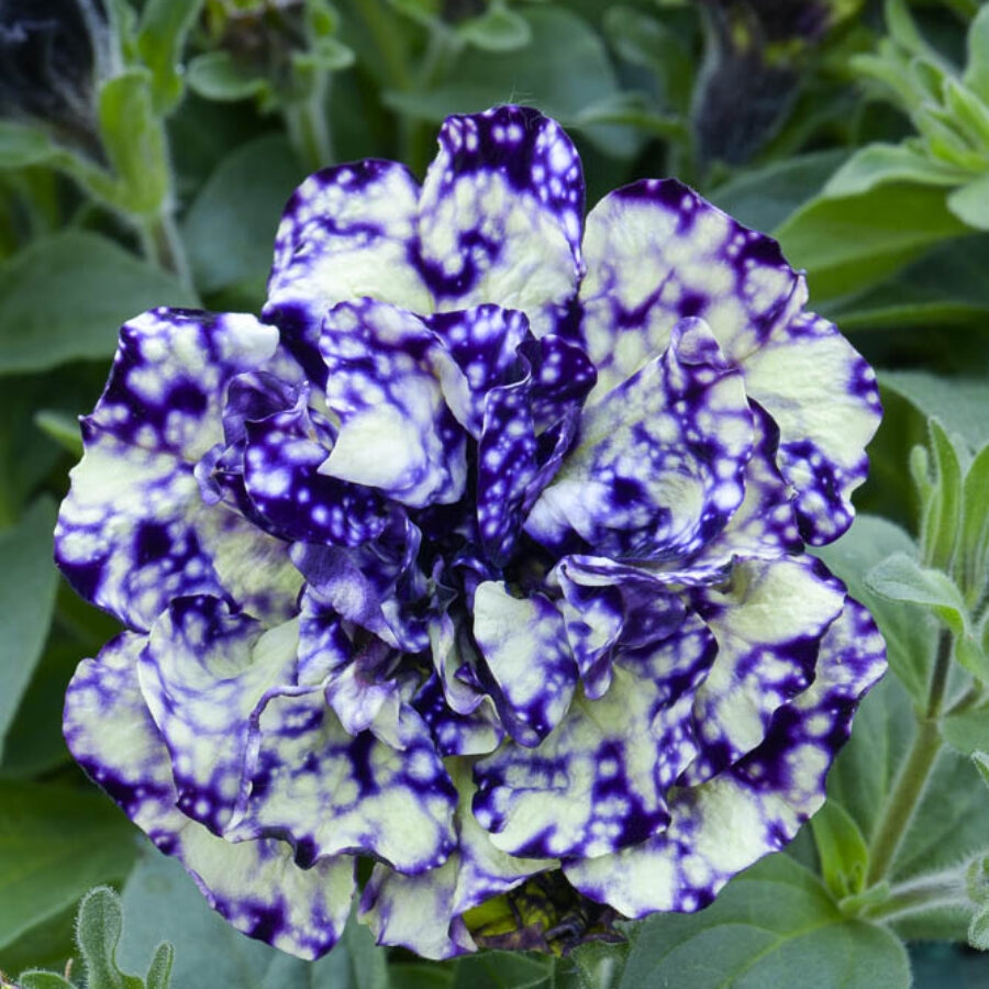 独特的深紫色花朵,花瓣上具有斑点和奶油色搭配,是引人注目的新式斑点重瓣矮牵牛。