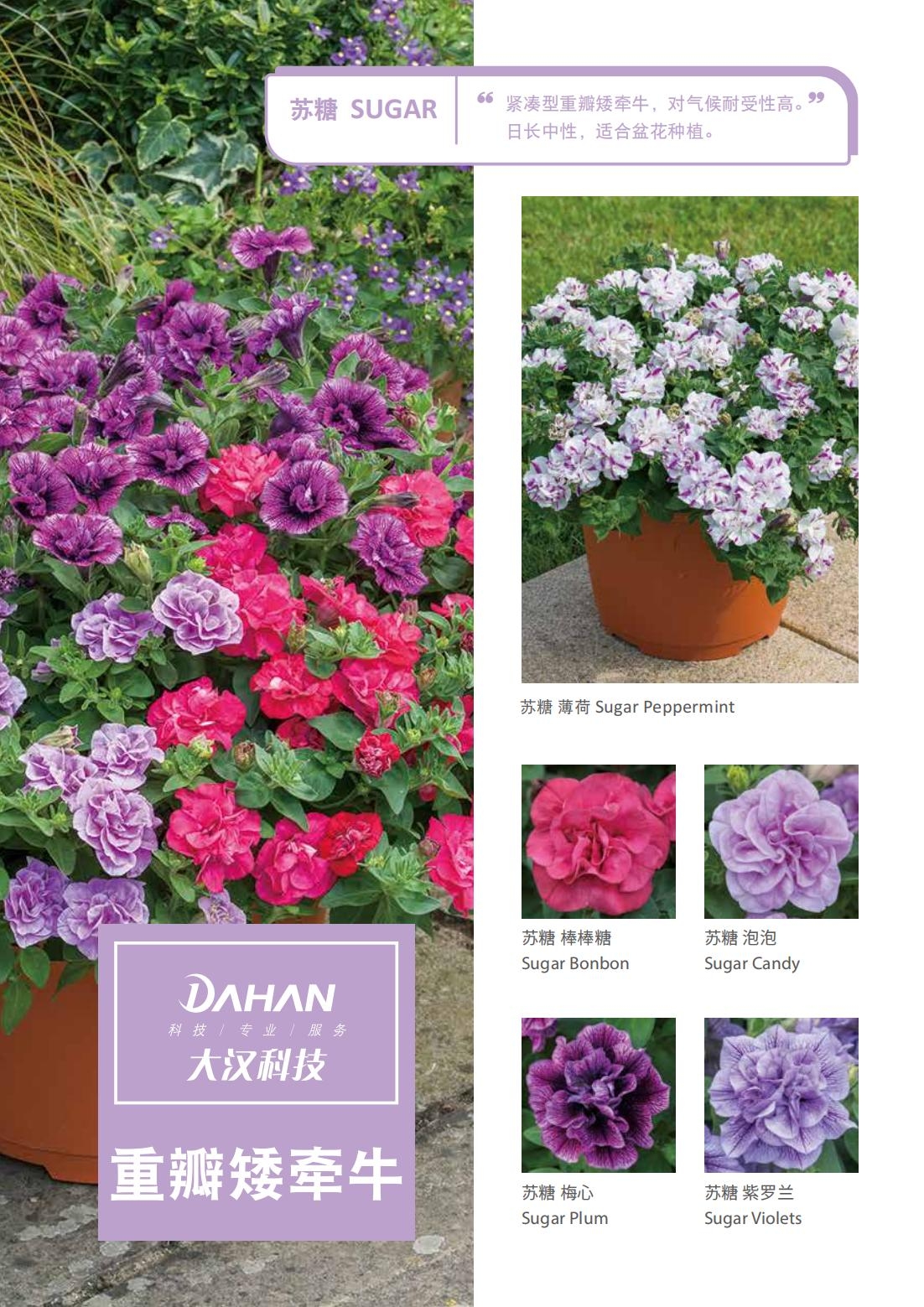 大汉集团与来自英国园艺世家的花卉育种公司英国柯叻Kerley 携手共同推广重瓣矮牵牛,由英国柯叻Kerley育种家生产的矮牵牛脱毒精英母本,在中国建立健康商业母本园,生产有根种苗,稳定供应给专业生产者,给园艺爱好消费者美丽的重瓣矮牵牛盆花。联络大汉专业服务团队及关注微信公众号,取得更多即时产品讯息。