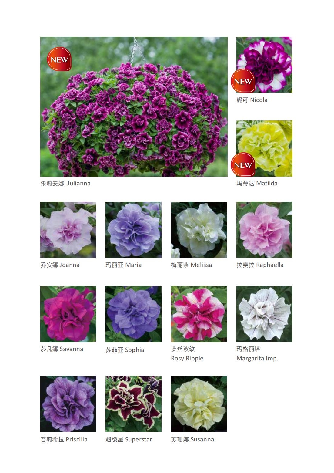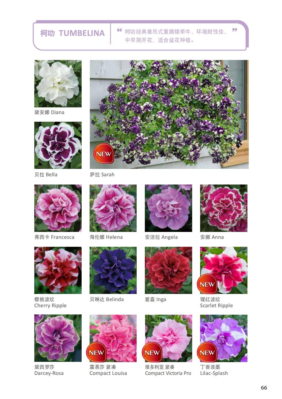 柯叻TUMBELINA经典系列重瓣矮牵牛,环境耐性佳,中早期开花,适合盆花及吊篮种植。最新推出新颖特殊花色品种,提供给爱好重瓣矮牵牛的消费者。